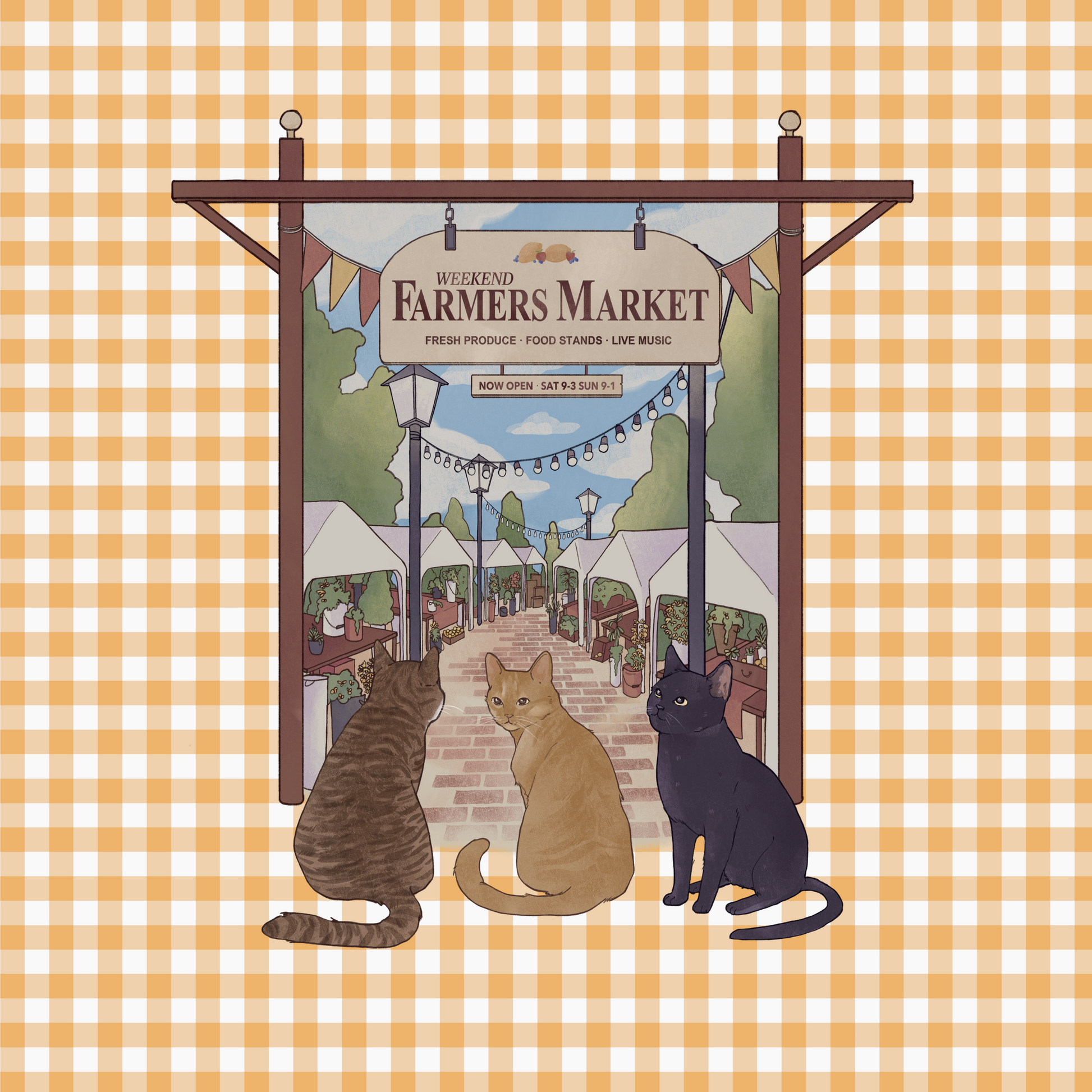 Whether you're picking up fresh herbs, library books, or an emergency croissant, this cheerful gingham tote is your cozy companion for everyday errands. Featuring our trio of curious cats - Chai, Truffle, and Muffin - on their way to the market, it’s a little slice of weekend charm you can carry year-round.